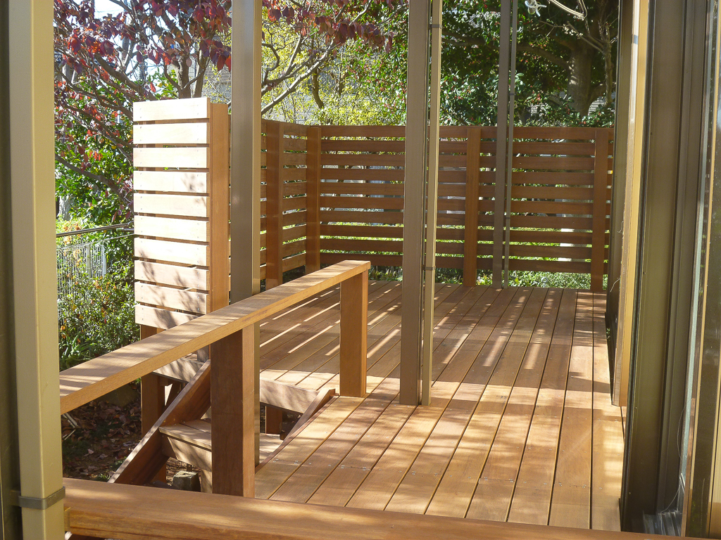 ウッドデッキに寝転び日向ぼっこができるお庭。