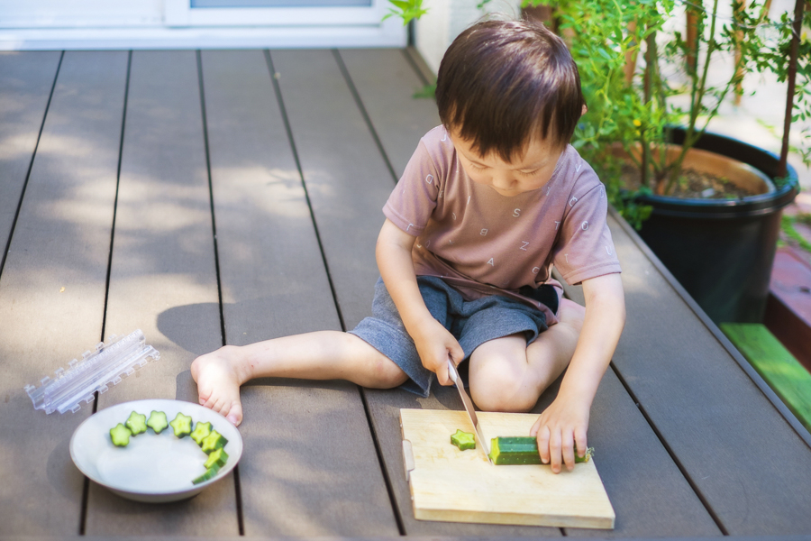 ウッドデッキの上で、クッキングタイム。 まな板を置いてトントンと食材を切るのも楽しいそうですね。♪